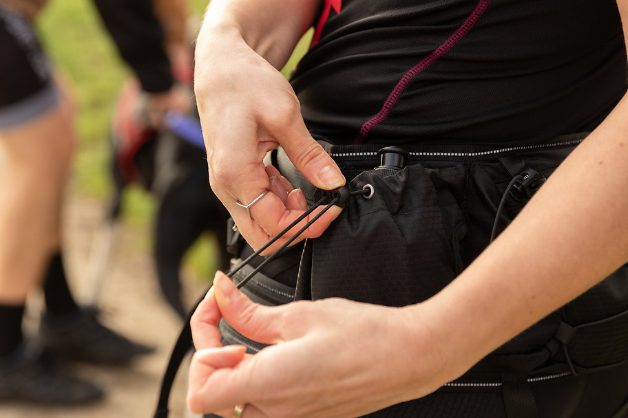 Ein ausgeklügeltes System von Gummibändern ist an der zentralen Tasche angebracht, um die Tiefe der Tasche zu verringern oder weitere Ausrüstung zu verstauen. Die beiden äusseren Flaschenhalter ermöglichen es, 500 ml Wasser in zwei Flaschen (im Lieferumfang enthalten) mitzunehmen.