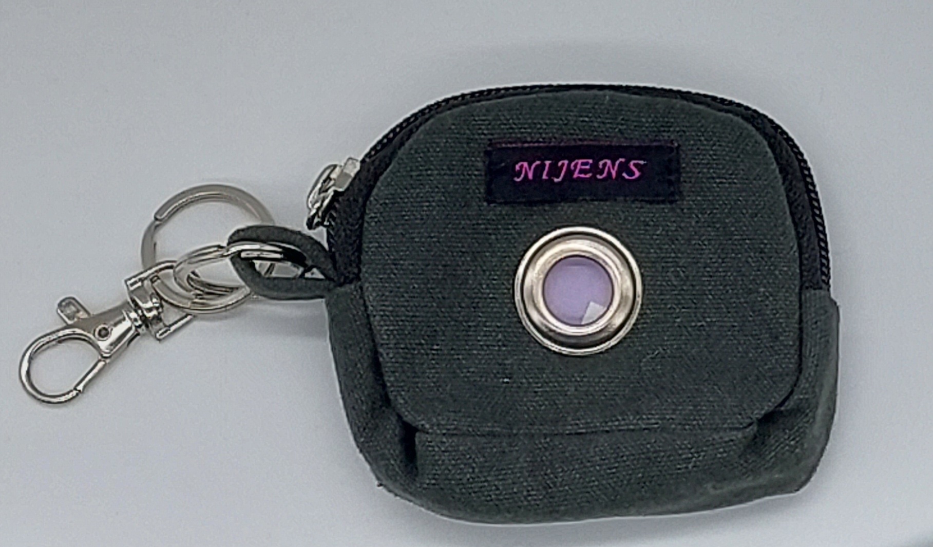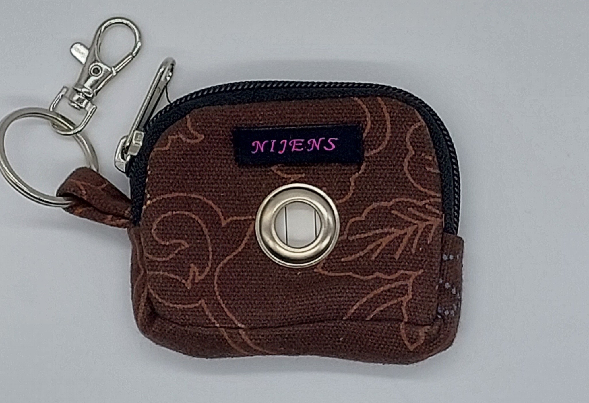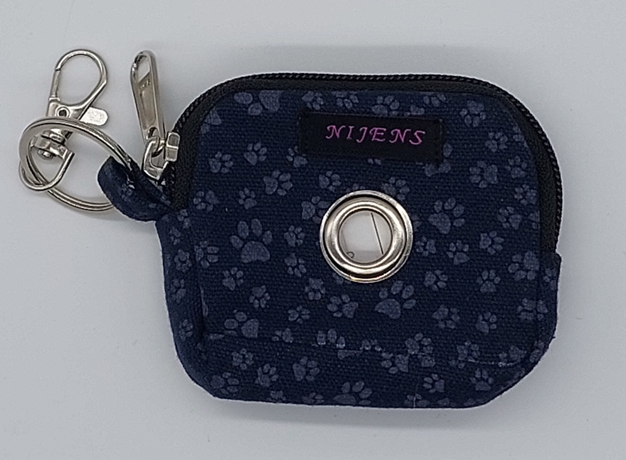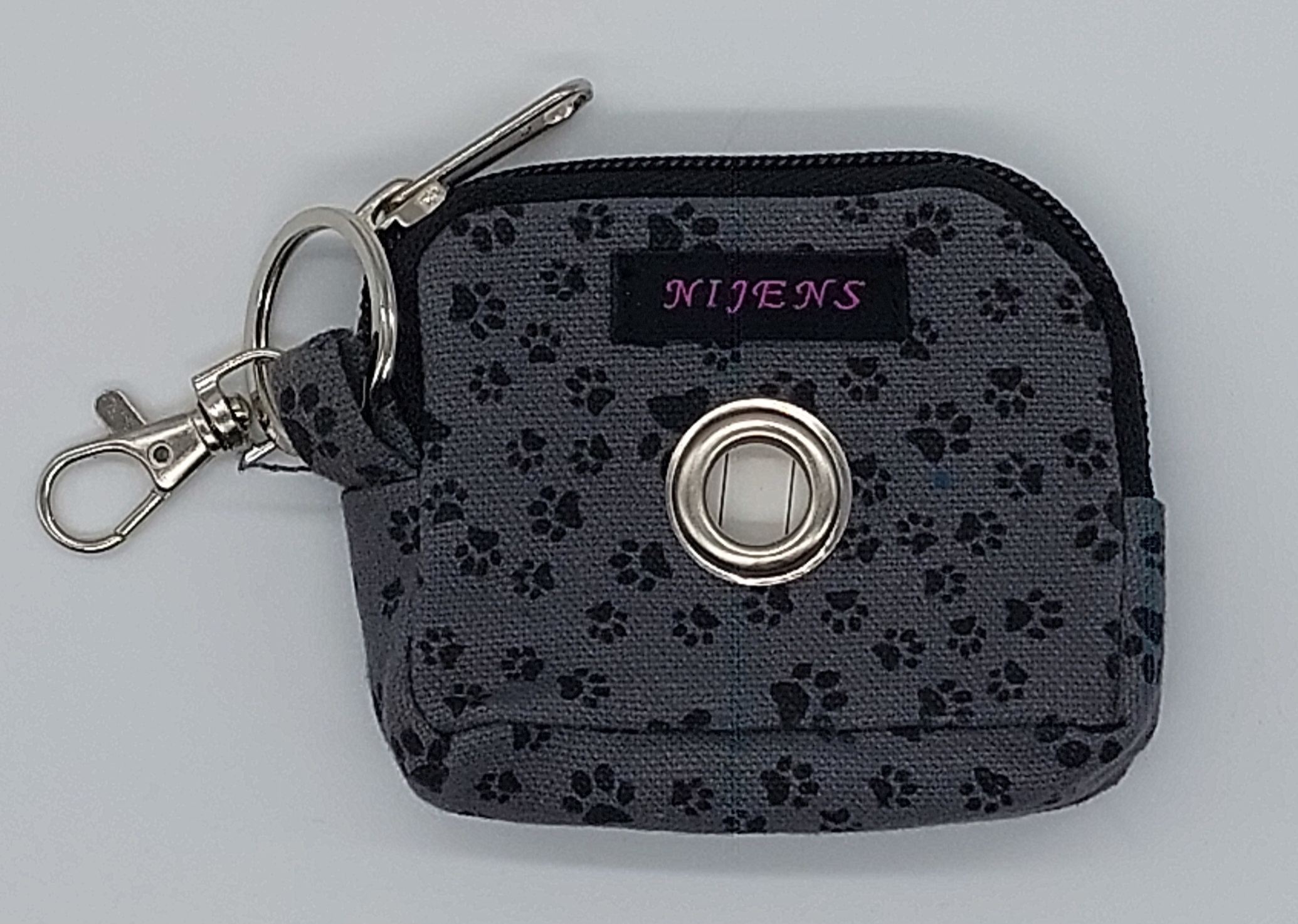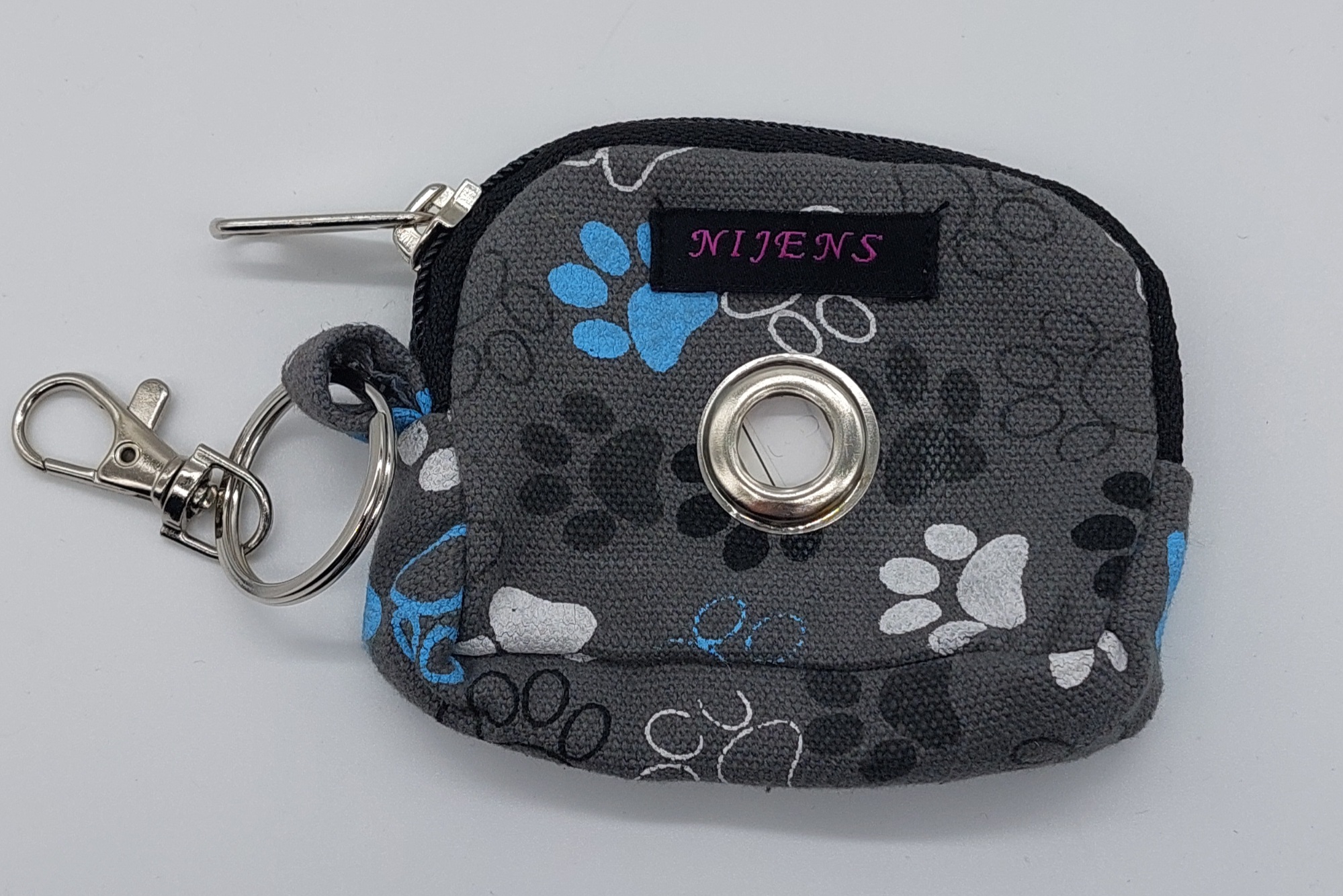 Kleine Beuteltasche aus bedrucktem Baumwollstoff mit Gürtelschlaufen und mit einem Fach für Hundekotbeutel.
