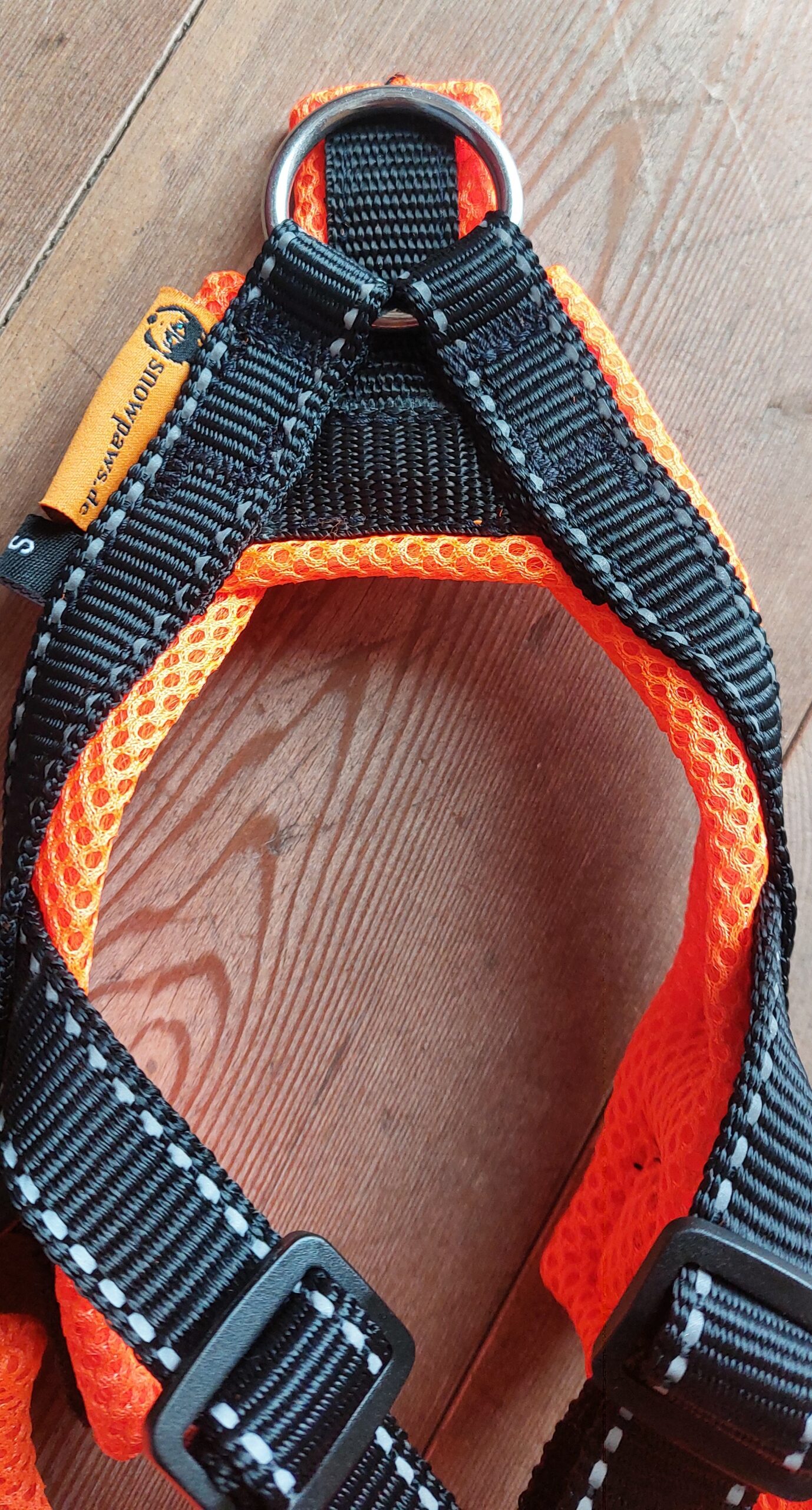 Snowpaws Trailgeschirr „Nukka 1size“ Größe S Gurtband Schwarz-r – Polster Airmesh neonorange – Paspelband silber